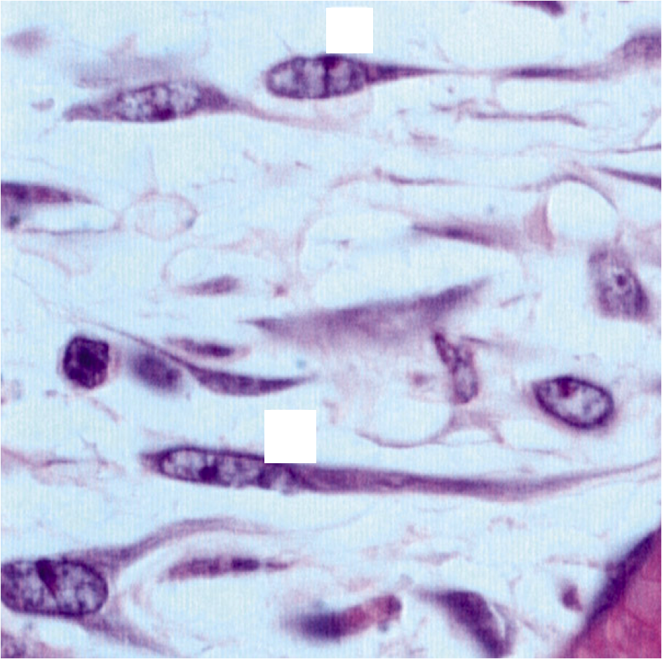 Mesenchymal cells: oval nucelus, prominent nucleoli, little cytoplasm, can fx as stem cells in adut tissue