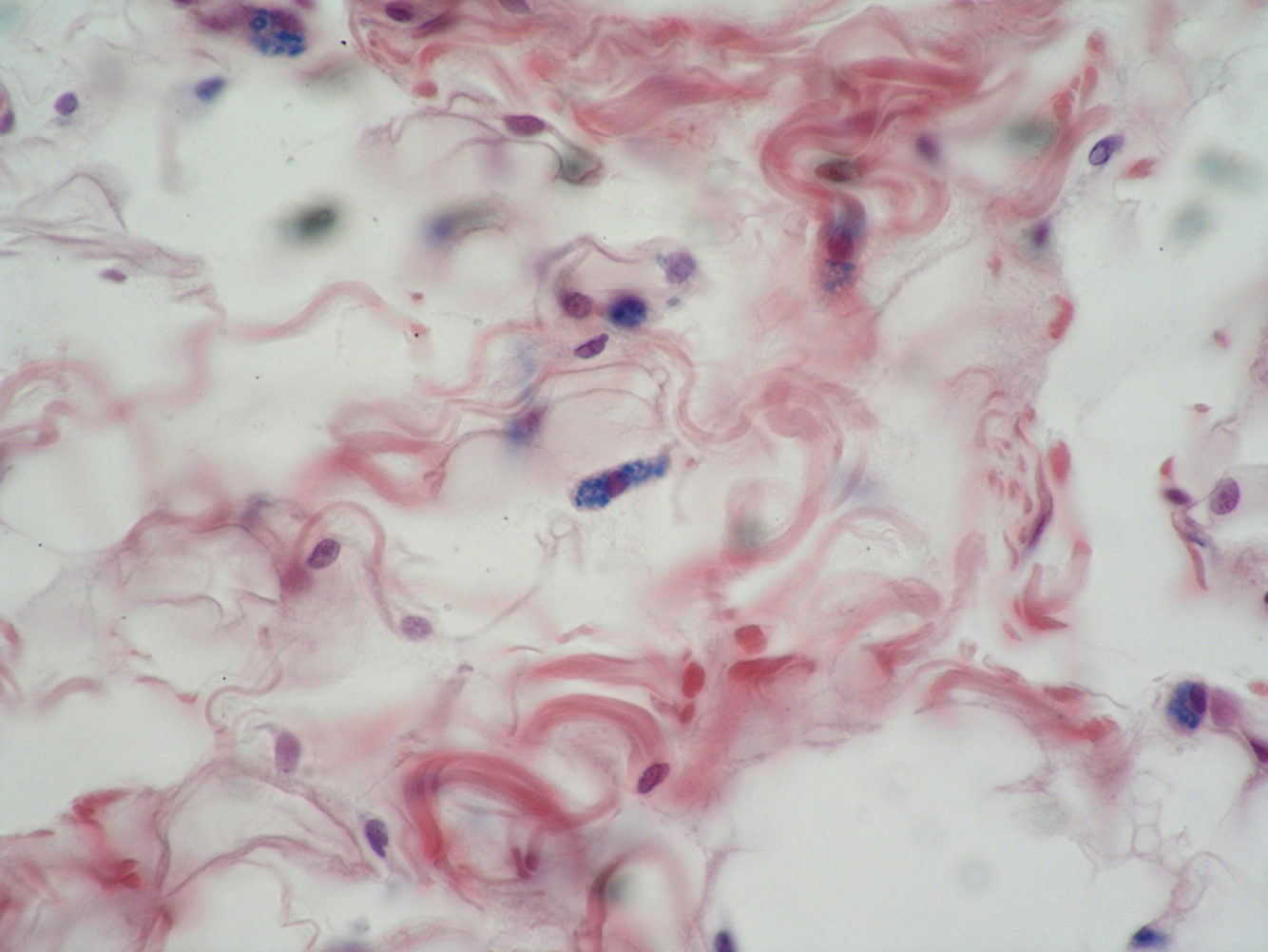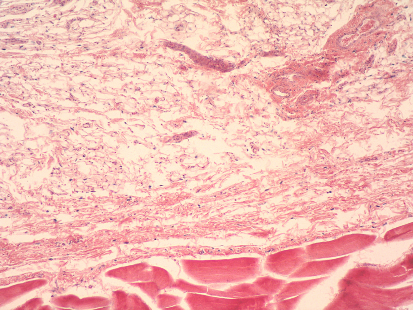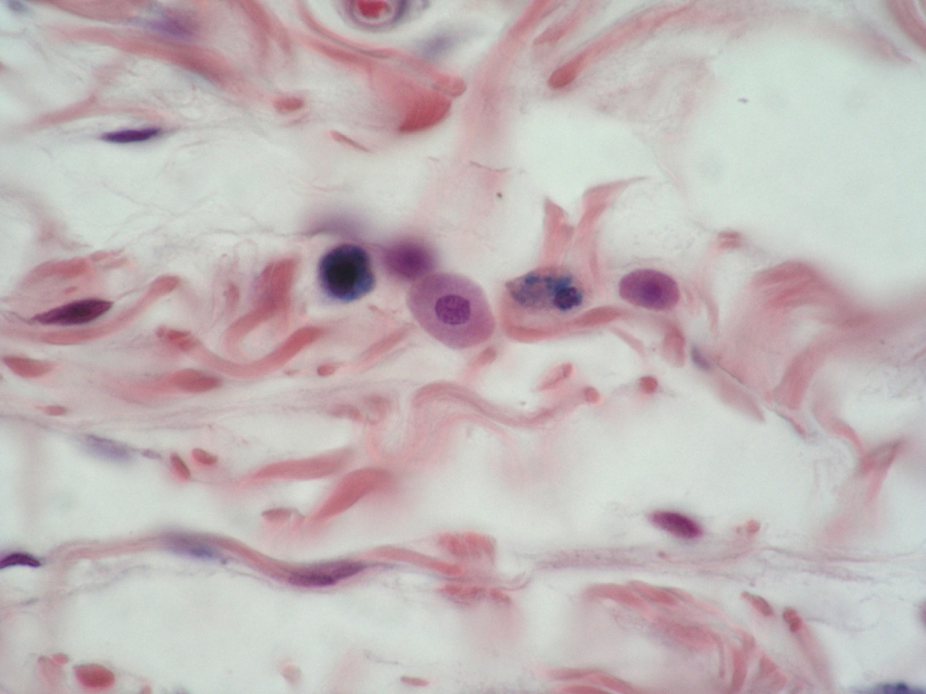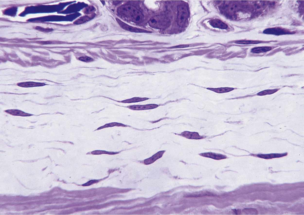 Loose connective tissue. Pink collagen fibers and many nuclei. Empty space filled by ground substance