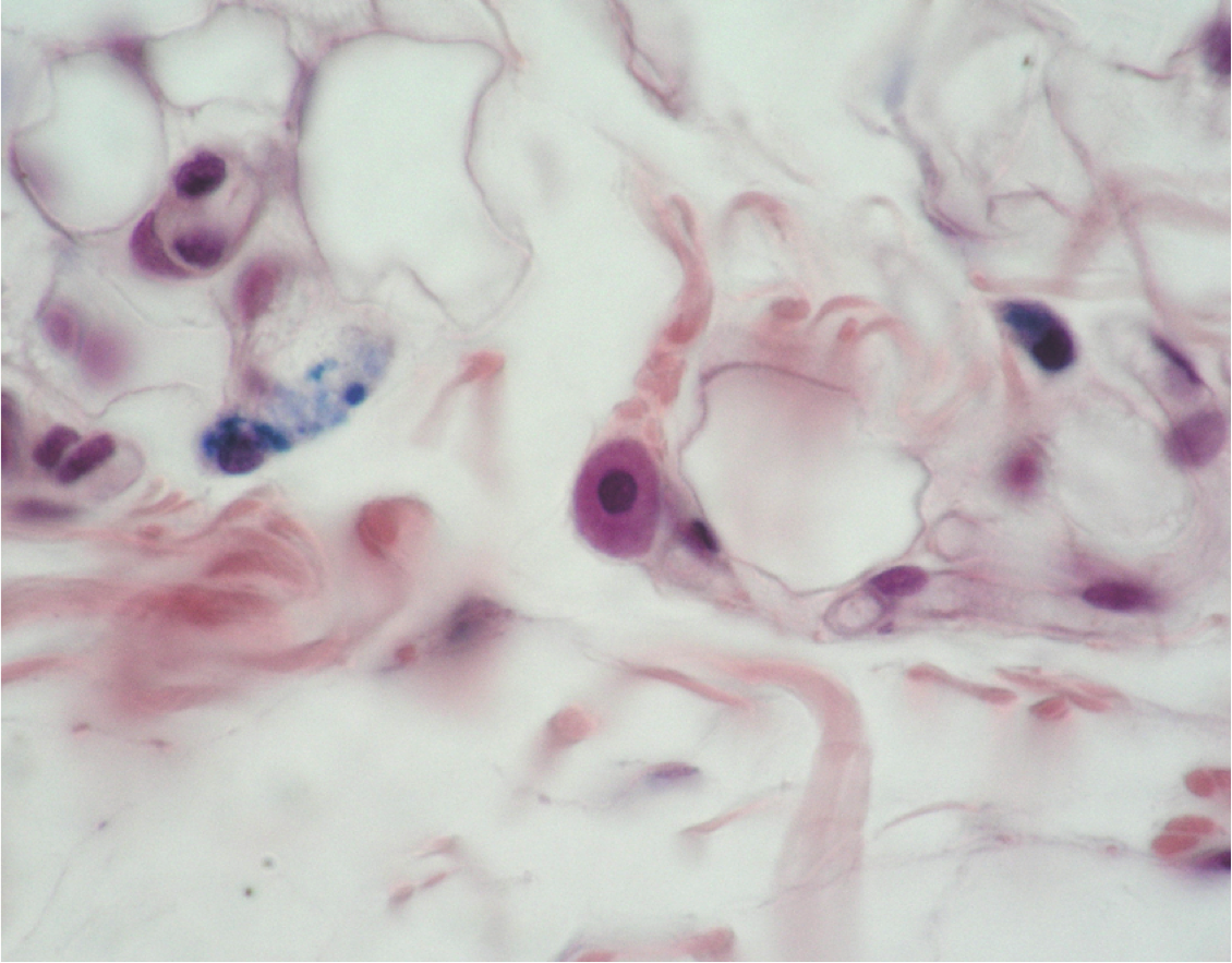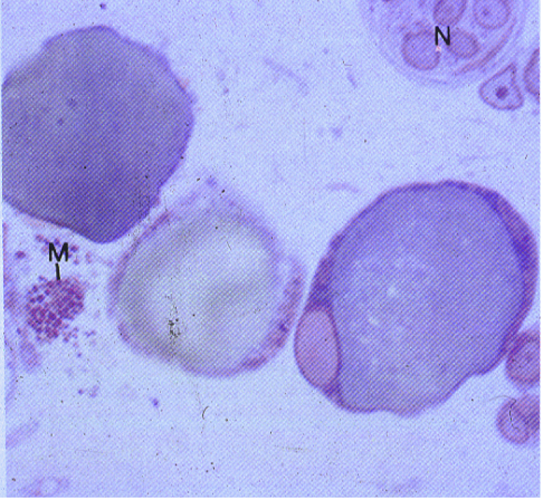 Macrophage in center. Stained with trypan blue (taken up by cytoplasm)