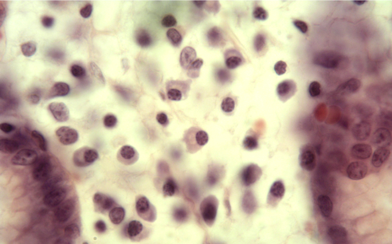 More cellular than dense CT, lots of resident cells