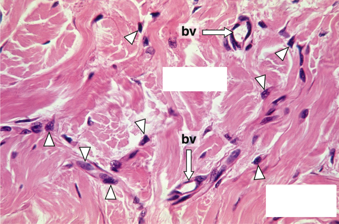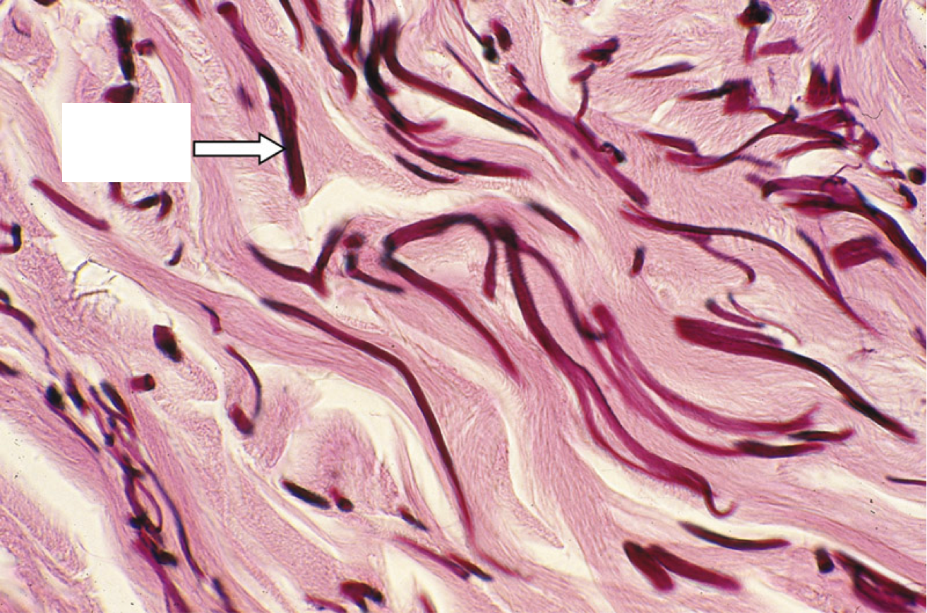 Pink squiggles are collagen, white arrow heads points at fibroblast nucleus