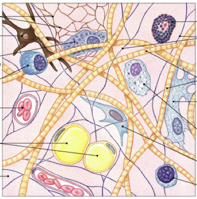 Connective tissue consists of cells and extracellular fibers in a ground substance and tissue fluid. There is generally abundant extracellular space in connective tissue; the cells are not tightly packed.