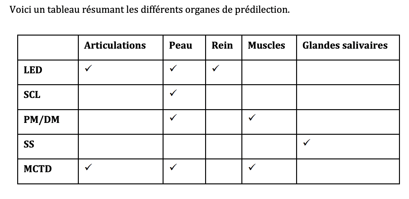 Voici un tableau résumant les différents organes de prédilection.