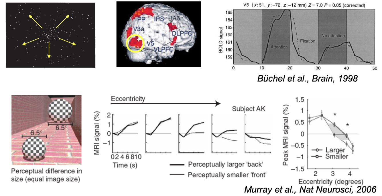 In the example from the lecture, a simple study shows that while V5 activity is modulated by the experimental condition (Attention), V1 is not. This is descriptive, but doesn’t provide definitive proof that it is actually attention that causes the difference in activation, as it could also be noise or other factor altering V5 activity.