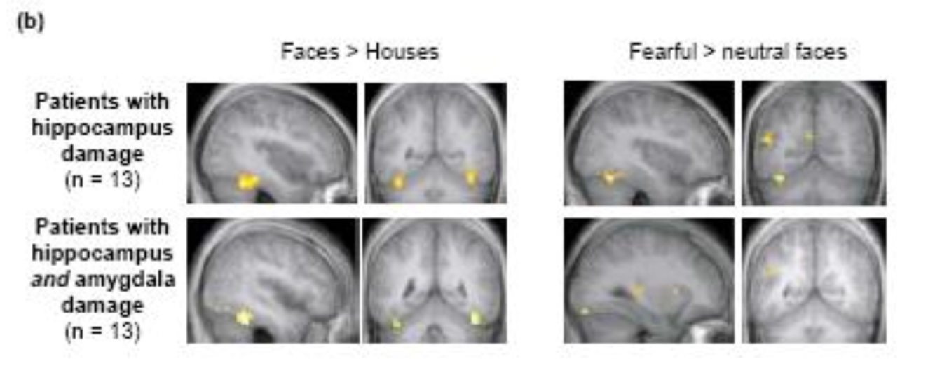For example, patients with Hippocampus damage and amygdala damage show increased FFA activation when viewing faces compared to houses.