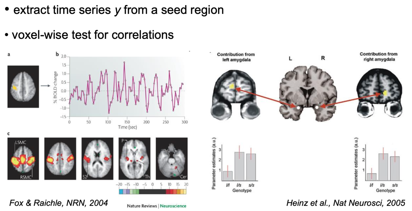 Examines how brain activity in a specified region (seed region) is correlated to voxels in other regions.