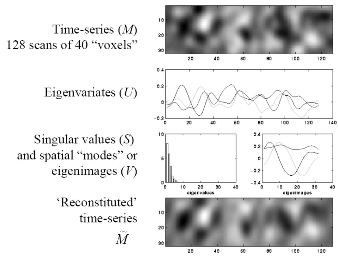 Singular Value Decomposition (SVD) takes in a matrix of voxel activation over time and space. This is used to create three new matrices: