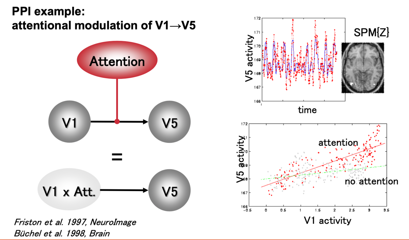 The interaction is thus “psycho-physiological”. In the experiment, the interaction between V1 activity and attention reliably explains V1 activity, which shows that the correlation between V1 and V5 is modulated by attention.