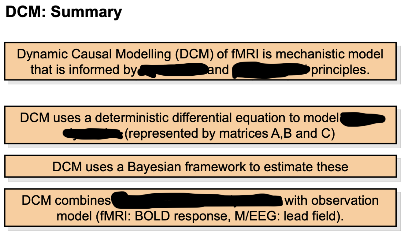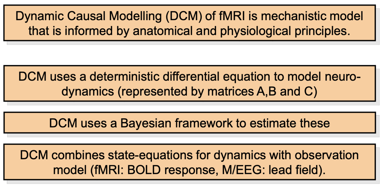 DCM is used to infer causal relationships in brain systems. A brain system can e.g. be the visual cortex. When working with DCM, a “system model” is constructed based on previous research on the area about information flow in the system and potential modulators of the information flow and how the system state changes over time as a response to different inputs.