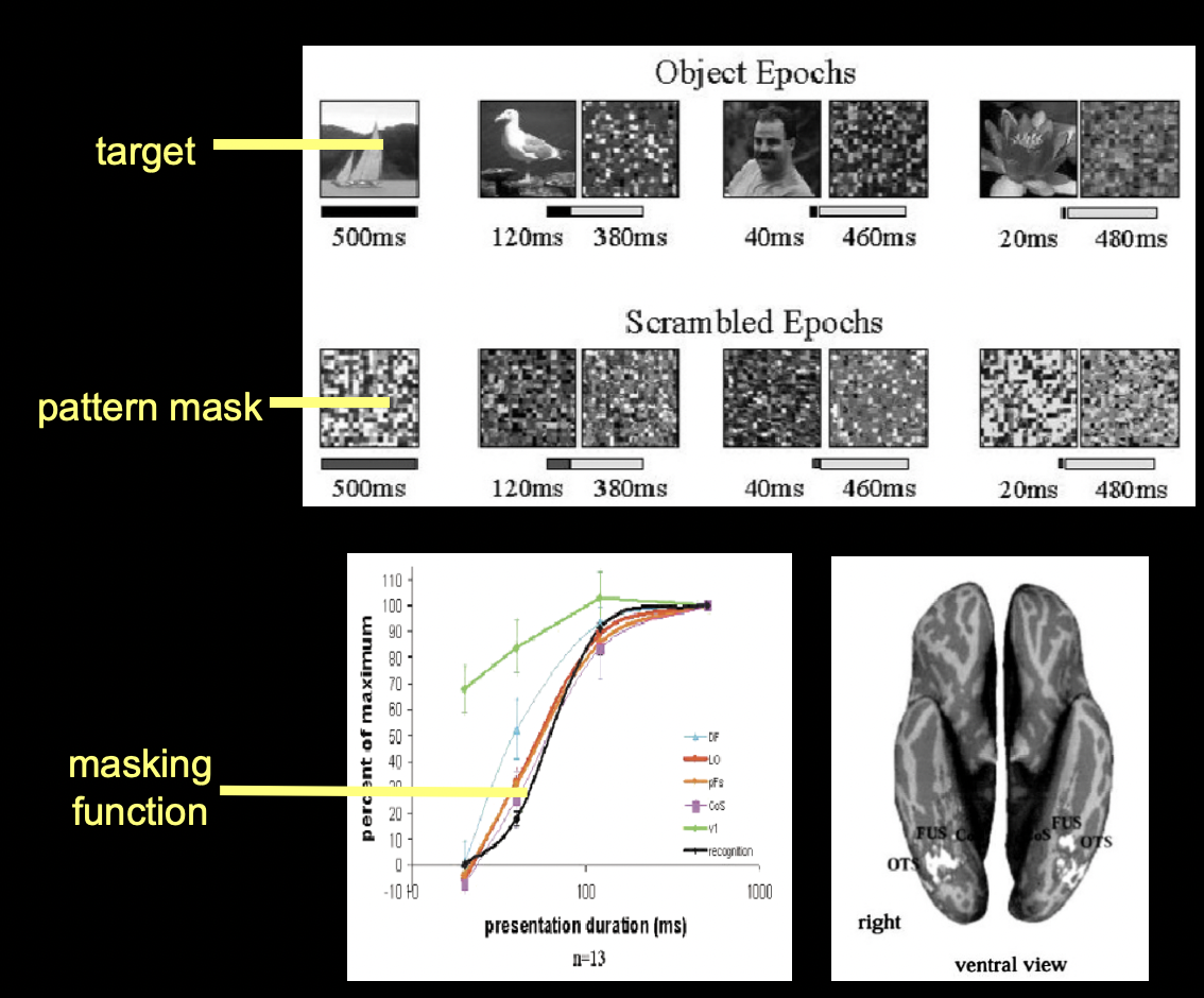target stimuli presented followed by a patterned mask -> likelihood of conscious experience correlates with duration of exposure to target stimuli