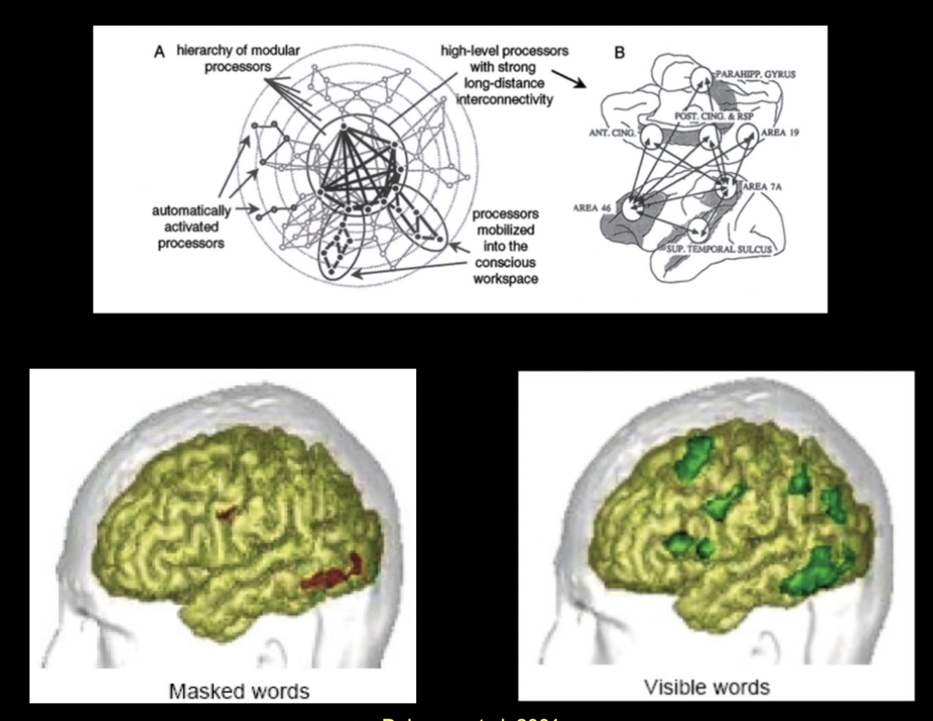 So, information can either be kept encapsulated and unconscious in specialised areas (e.g. visual cortex), or propagated into the ‘global workspace’ (certain high-level cortical areas that propagate stimulus information across long-range connections)