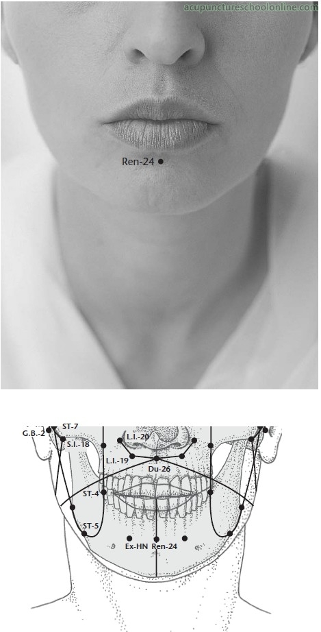 Meeting point of the Conception vessel with the Stomach and Small Intestine channels