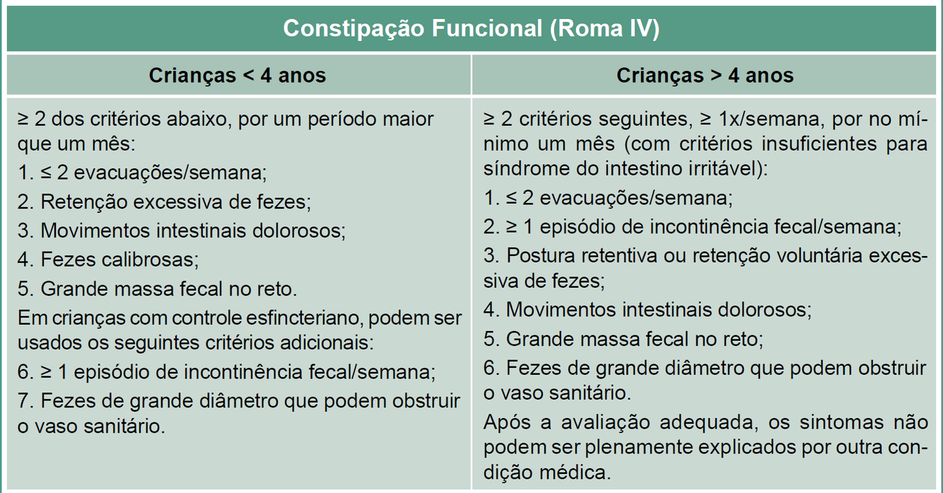 Atraso/dificuldade de defecação por > 2s. Não é provocada por qualquer anormalidade estrutural ou funcional no TGI.