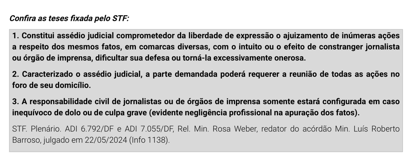 1- O assédio judicial foi tratado em 2024, em informativo do STF de relatoria da Ministra Rosa Weber, versando sobre tema envolvendo abusos contra jornalistas.