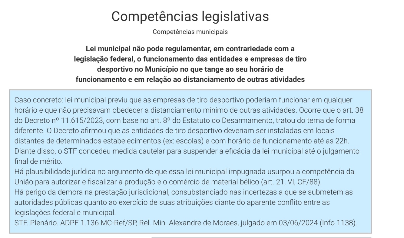 Assim, não pode uma lei municipal tratar de modo diverso do previsto em legislação federal acerca do horário de funcionamento e localização das entidades e empresas de tiro desportivo.