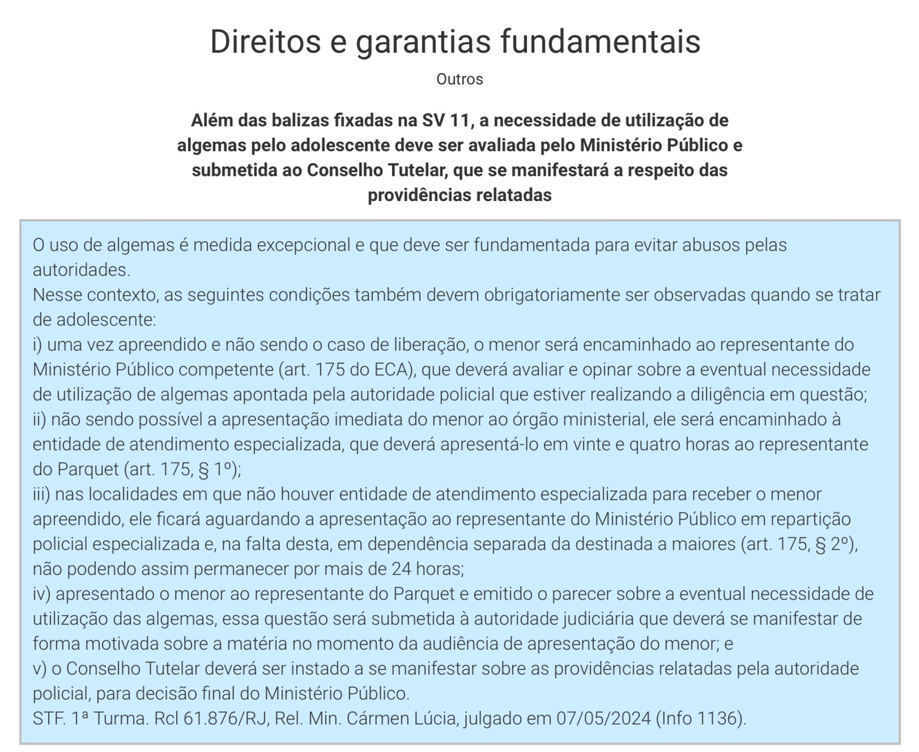 Em se tratando de menor de idade, além das balizas fixadas na Súmula Vinculante nº 11, a necessidade de utilização de algemas apresentada pela autoridade policial deve ser avaliada pelo Ministério Público e submetida ao Conselho Tutelar, que se manifestará a respeito das providências relatadas.