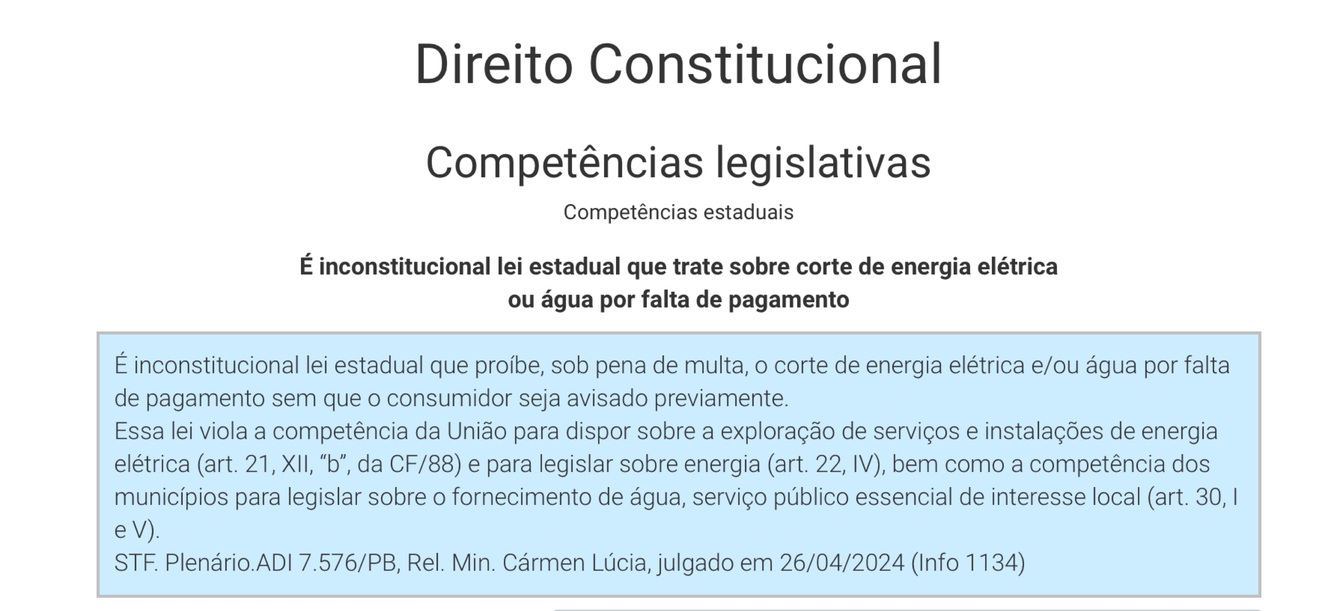 ❌ Lei ESTADUAL que trata sobre o corte de energia elétrica e/ou água é INCONSTITUCIONAL.