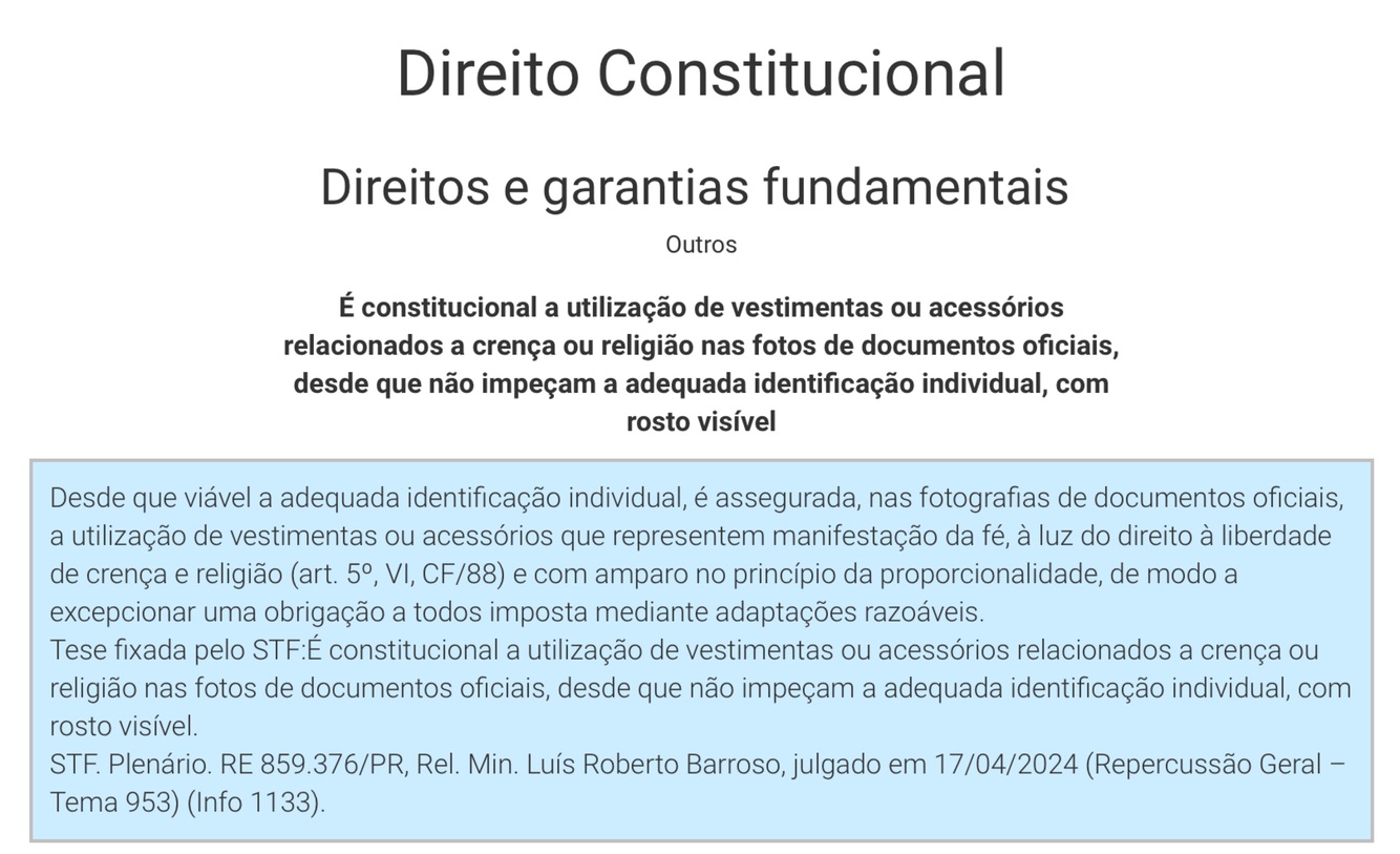 ✅ É CONSTITUCIONAL a utilização de vestimentas ou acessórios relacionados a crença ou religião nas fotos de documentos oficiais, desde que não impeçam a adequada identificação individual, com rosto visível.