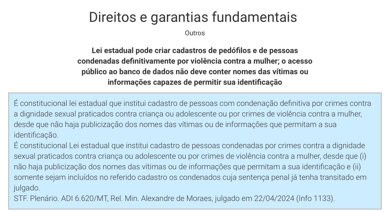 ✅ É constitucional Lei estadual que institui cadastro de pessoas condenadas por crimes contra a DIGNIDADE SEXUAL praticados contra CRIANÇA OU ADOLESCENTE 🙇🏽♂️ ou por crimes de VIOLÊNCIA CONTRA A MULHER 🙍🏻♀️, desde que:
