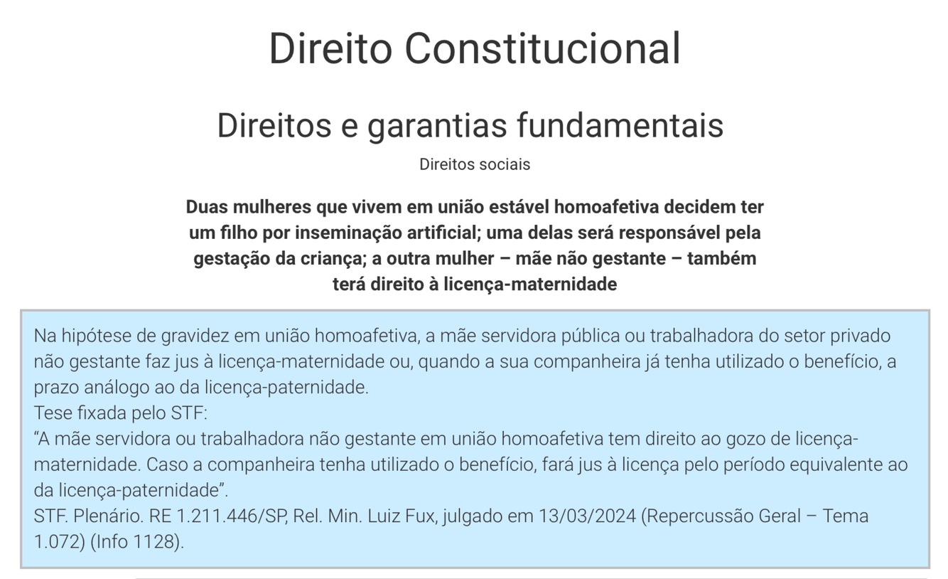 💖 Na hipótese de gravidez em união homoafetiva, a mãe servidora pública ou trabalhadora do setor privado não gestante faz jus à licença-maternidade ou, quando a sua companheira já tenha utilizado o benefício, a prazo análogo ao da licença-paternidade.