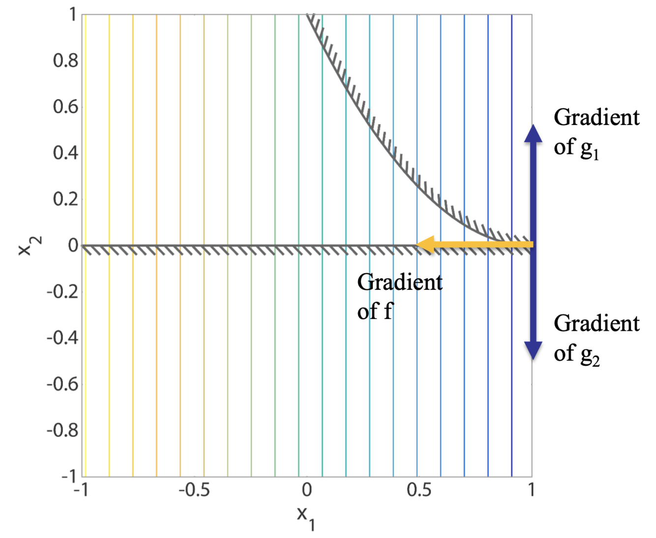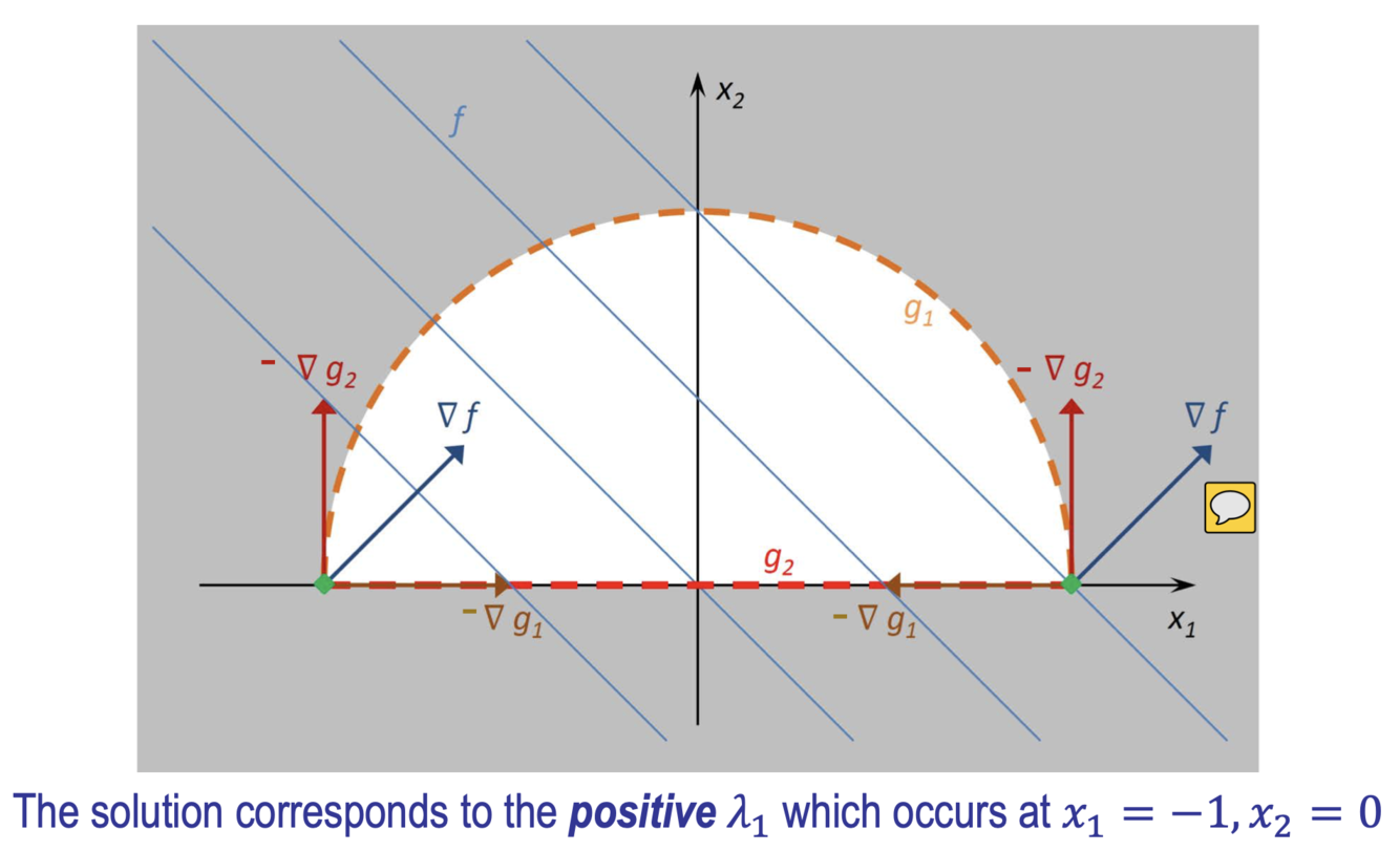 line, so the objective function’s gradient must point in exactly the opposite direction as the inequality constraint’s gradient