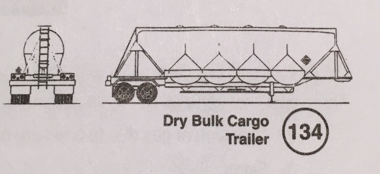 Trailer with v-shaped hoppers along underside.