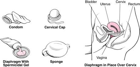 Typically rubber structures with metal inner frame that span the posterior fornix to the anteriorinferior wall of vagina; they cover cervix and hence prevent sperm entering. Held in place by vaginal muscles, tension of ring & pubic bone. Often combined with spermicide to increase effectiveness.
