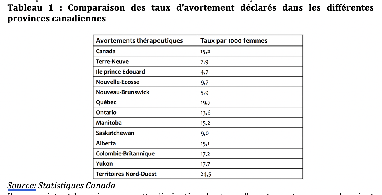 Tableau 1 : Comparaison des taux d’avortement déclarés dans les différentes provinces canadiennes
