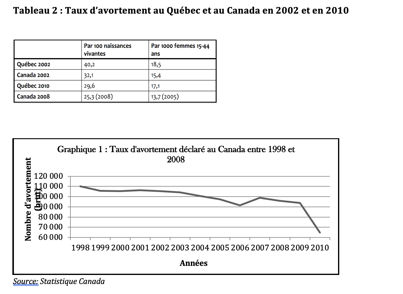 Tableau 2 : Taux d’avortement au Québec et au Canada en 2002 et en 2010