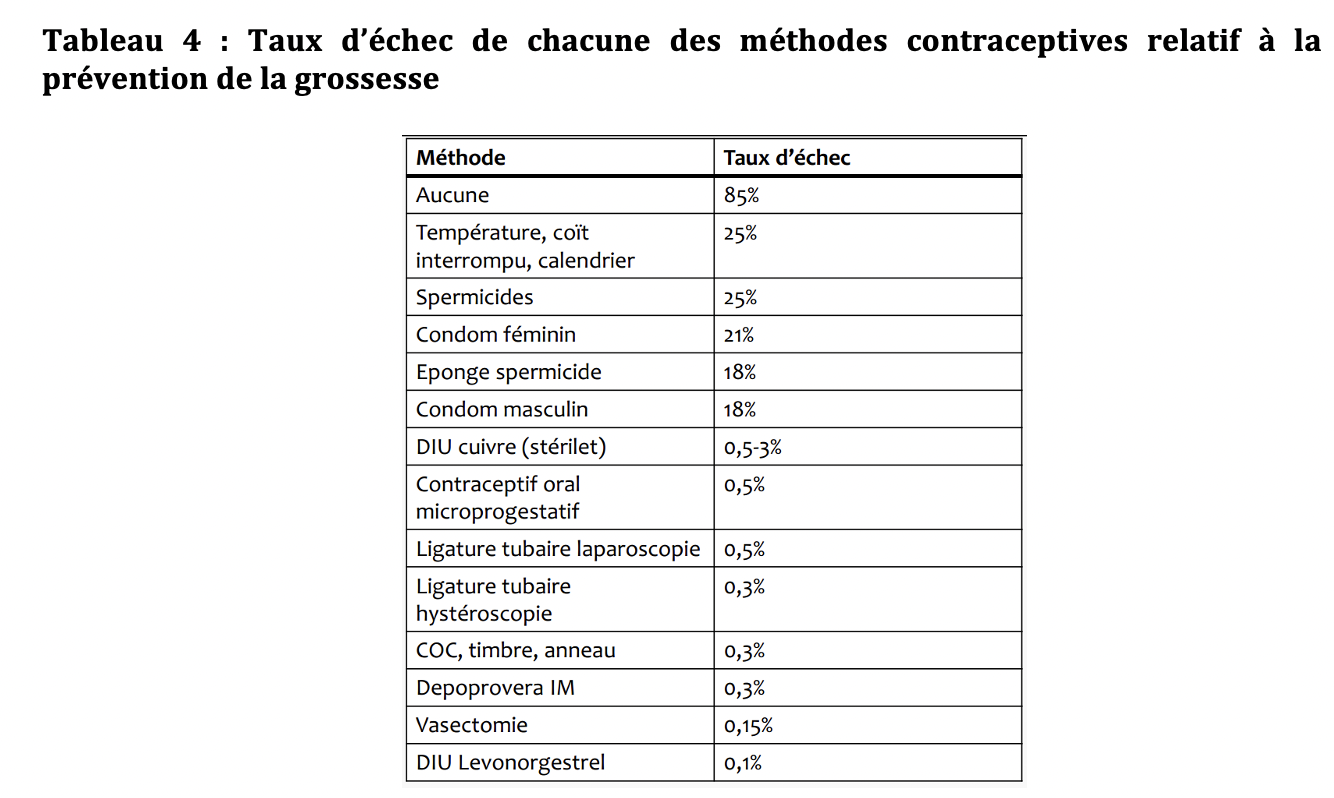 Tableau 4 : Taux d’échec de chacune des méthodes contraceptives relatif à la prévention de la grossesse