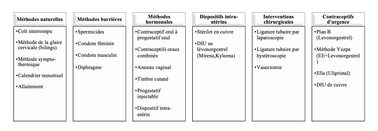 Les différents moyens de contraception peuvent être classés en 6 catégories