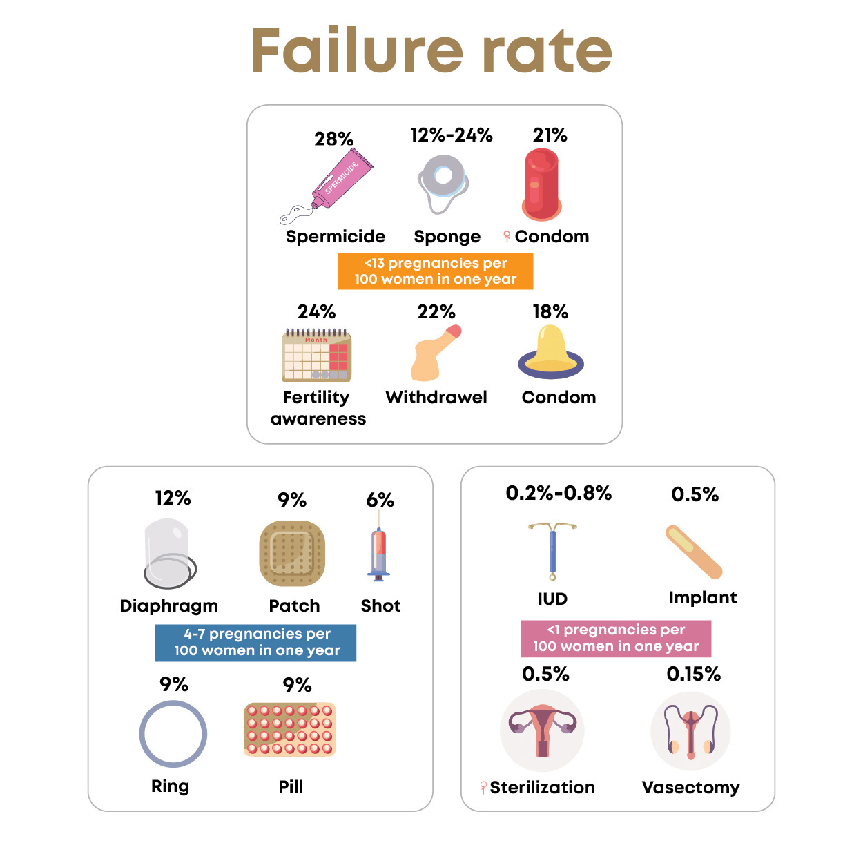 Failure rates range from 0.15% - 28% when used correctly.
