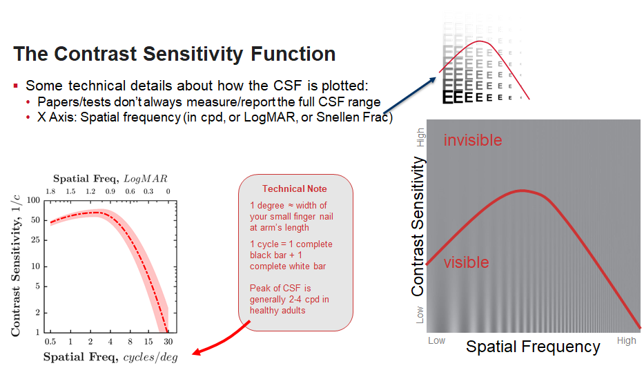 Contrast sensitivity is dependant on spatial frequency thus you can’t just tell someone their contrast sensitivity is a certain value but rather you tell them their function ( in the sense that mathematically a function is an expression/line that is dependant on one or more variables - in this case spatial frequency.