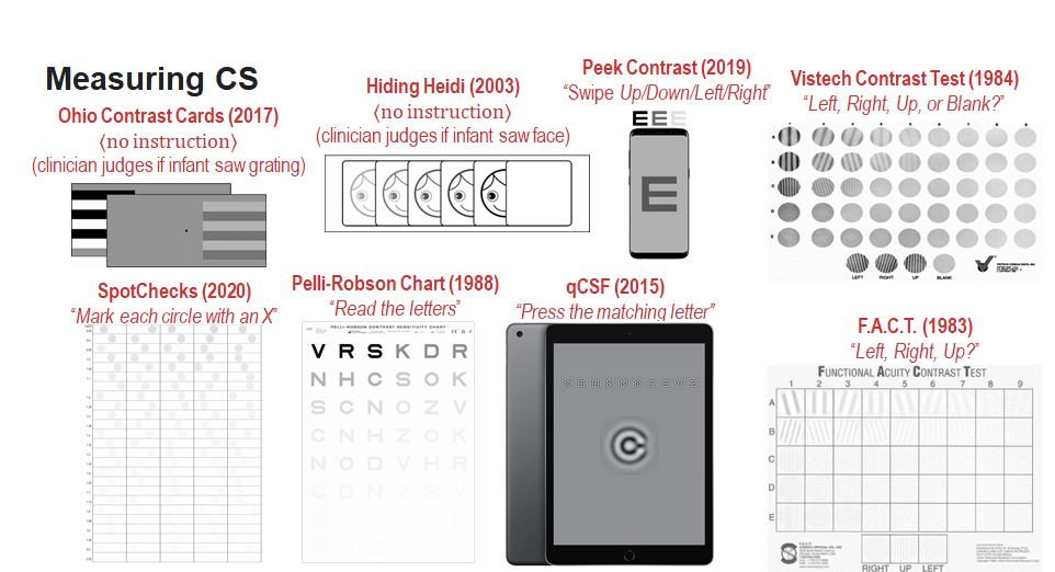 What are the different ways in which contrast sensitivity can be measured i.e. what are the different CSF tests available?