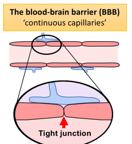 Continuous capillaries with TIGHT junction - charged/lipid molecules cannot pass Blood brain barrier