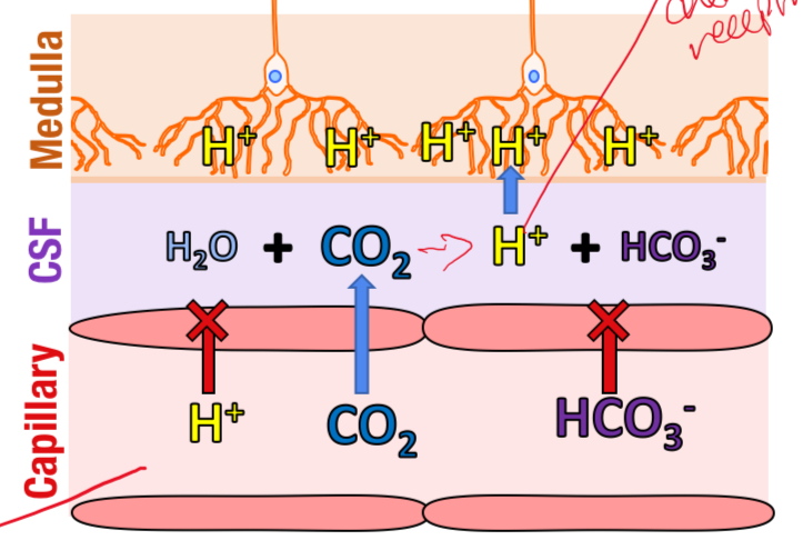 CO2 is lipid soluble and easily crosses Blood Brain Barrier; into CSF