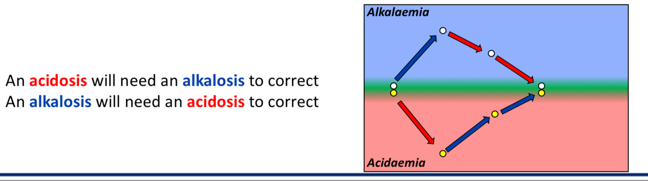 Changes in H+ and HCO3- retention/secretion in kidneys can stimulate a SLOW compensatory response to increase/decrease pH respectively
