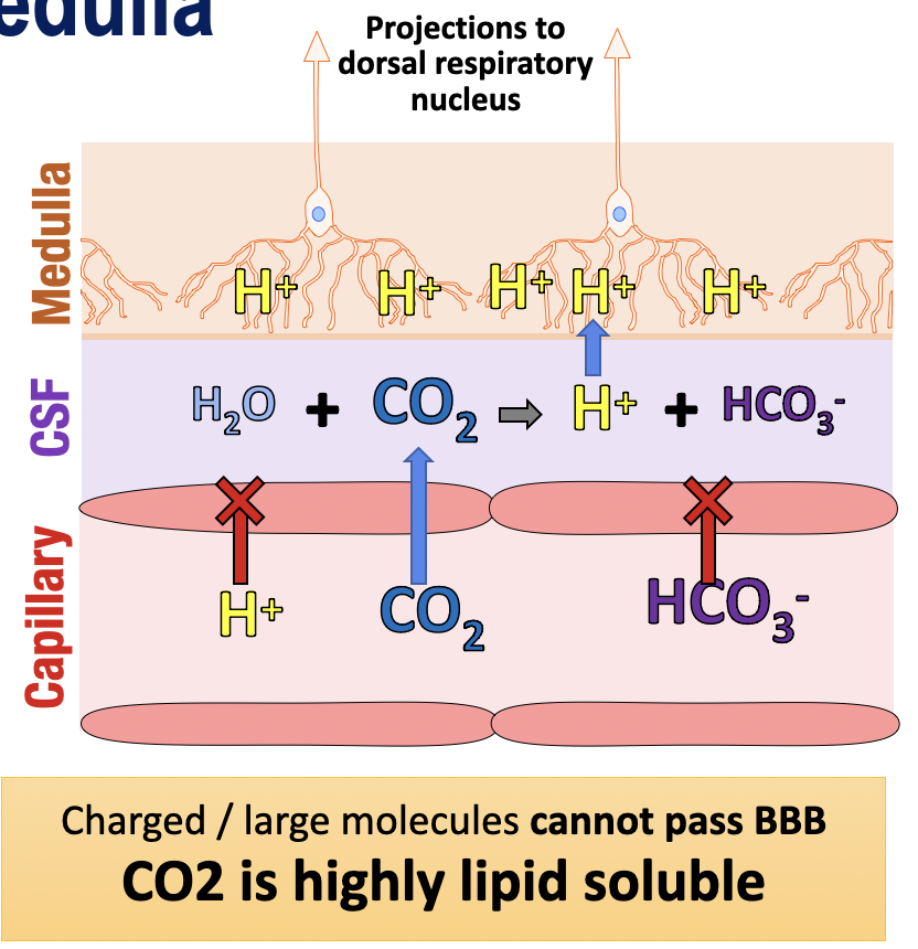 CO2(due to high lipid solubility) passes from capillary to CSF