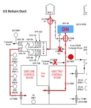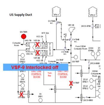 Flow switch with indicating lights in control room above VSF-9 HS will give indication of adequate flow. GREEN means fan secured or inadequate flow. RED means > 1500 cfm.