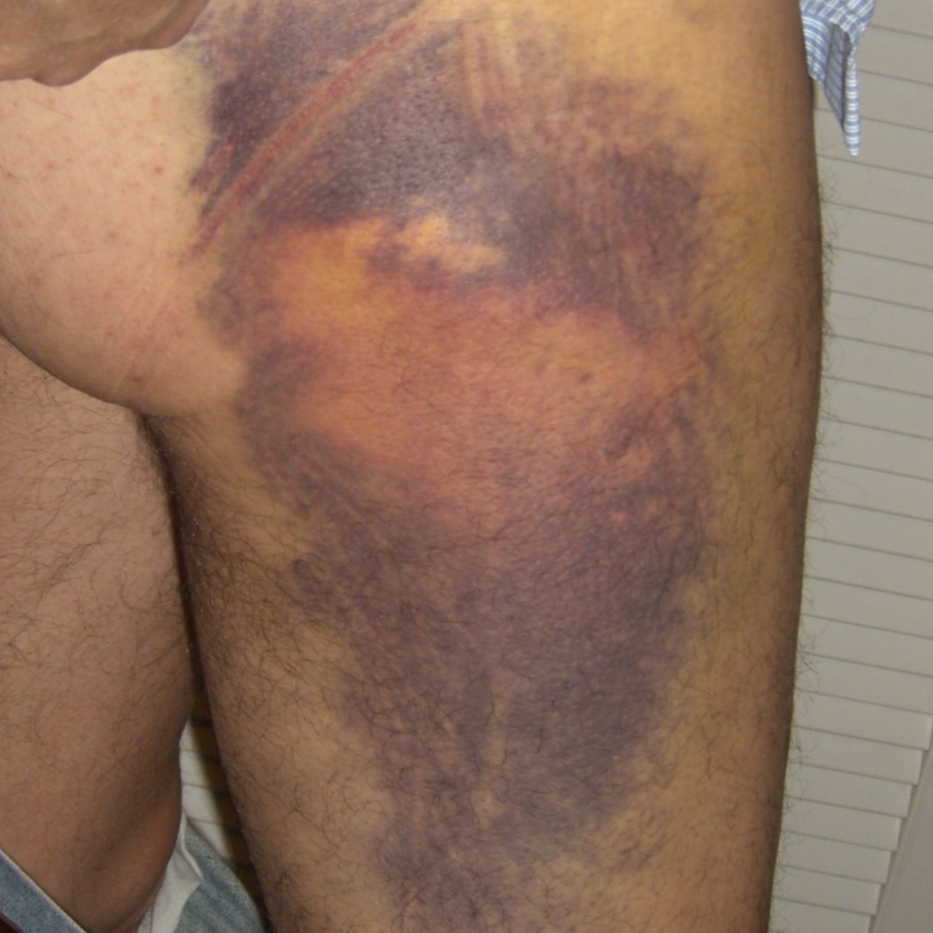 Active resisted isometric testing of the affected muscle will reveal pain at the injury site. The contraction of the muscle is held to the onset of pain only. Severity of contusion is graded in the following manner: