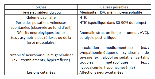 ATCD trauma crânien ou infection SNC, troubles neurologiques connus, prises de drogues ou sevrage, sevrage alcoolique, ATCD familiaux d’épilepsie ou de mx neurologiques