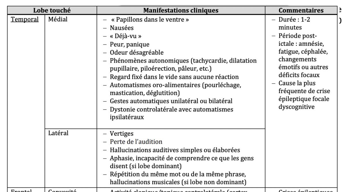 Crises épileptiques: Manifestations cliniques - Crises focales LOBE TEMPORAL LATÉRAL