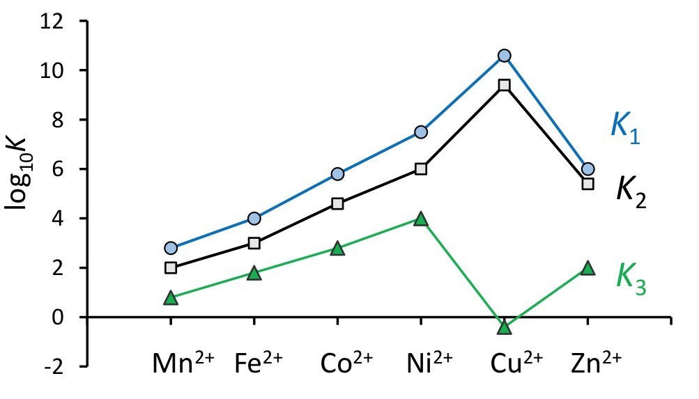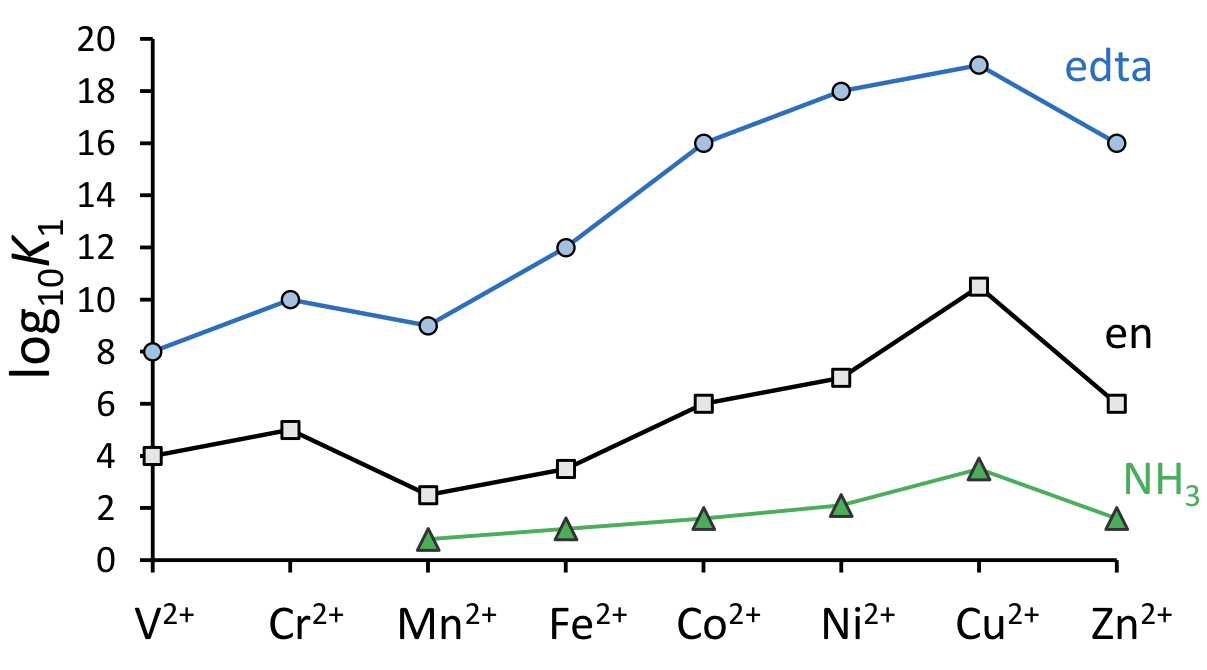 Cu2+ is high (when n=1-4) as JT effect - strong binding of ligand in xy plane