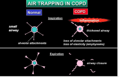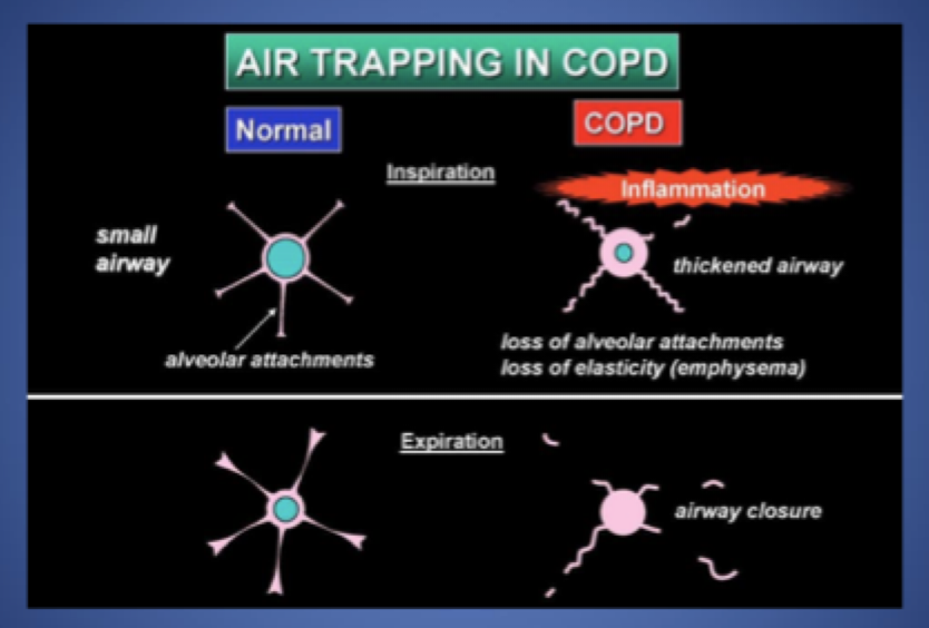 -airway collapses on expiration -> AIR TRAPPING bc inefficient breathing