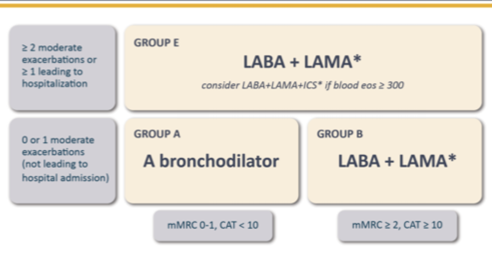Group E- LABA+LAMA (has has exacerbations + hospital visit) -> consider LABA + LAMA + ICS -> prof is hesitant to give steroid ever