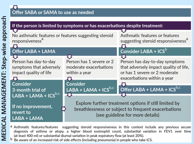 Spirometry - obstructive condition - FEV1/FVC less than 70%, little or no response to reversibility test with B2agonist.
