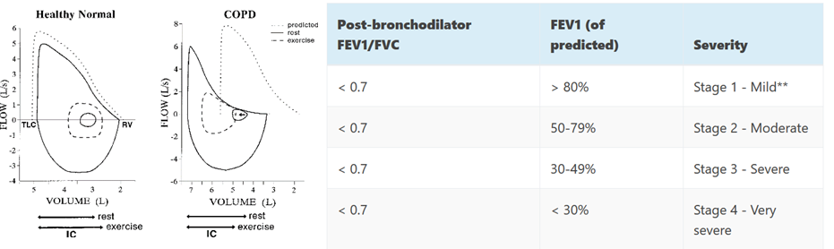 In pulmonary function testing, a post-bronchodilator FEV1/FVC ratio of <0.70 is commonly considered diagnostic for COPD. The GOLD system puts airflow limitation into stages: