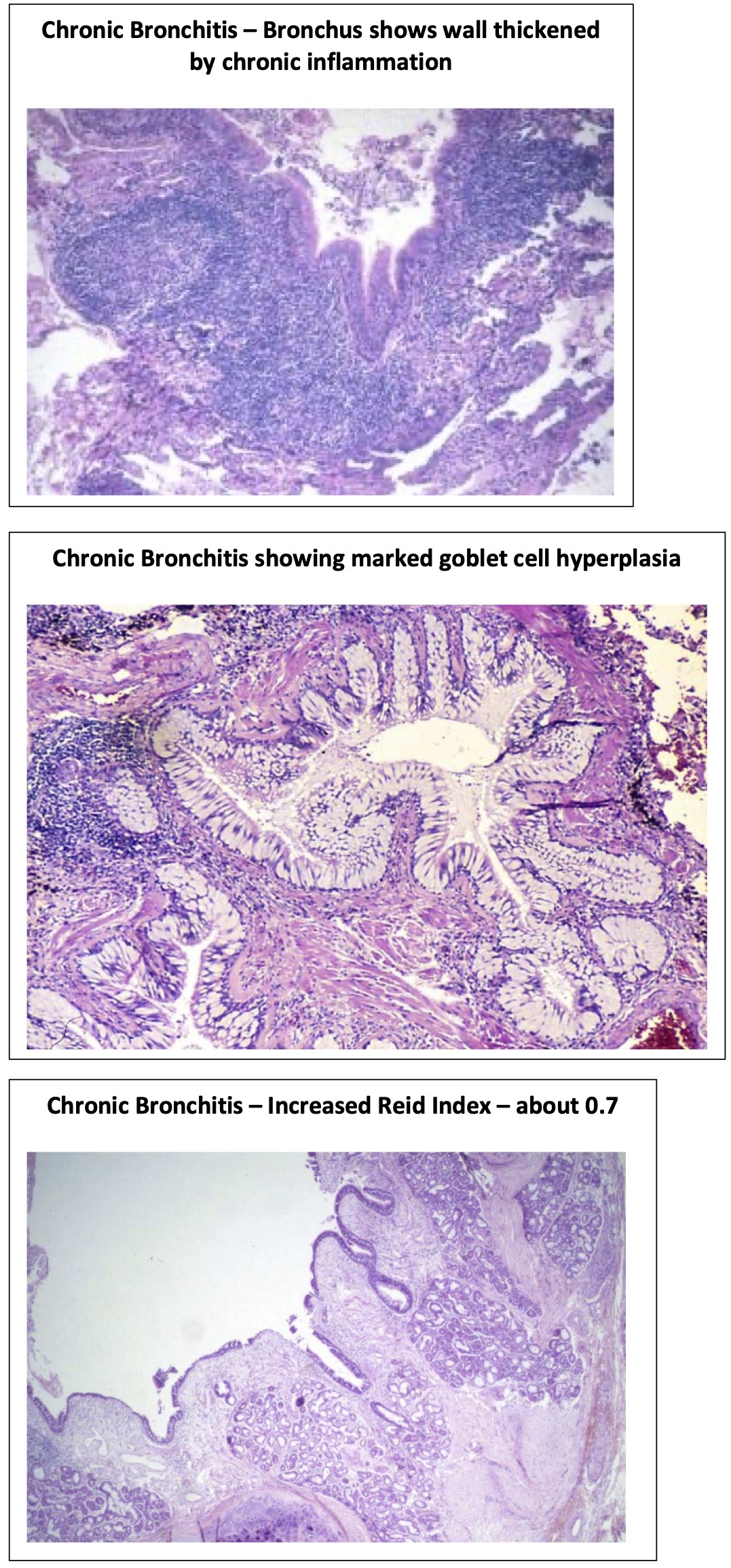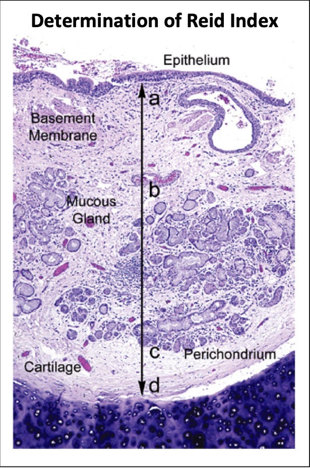 Ratio of bronchial glands to the entire thickness of bronchial wall from epithelium to top of the cartilage.