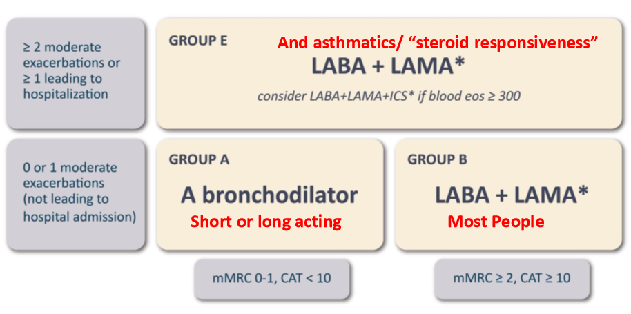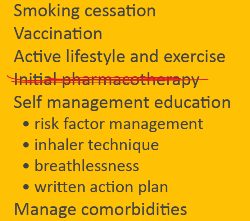 Guidline is bronchodilators, consider ICS, consider antibtioics - for exam know this
