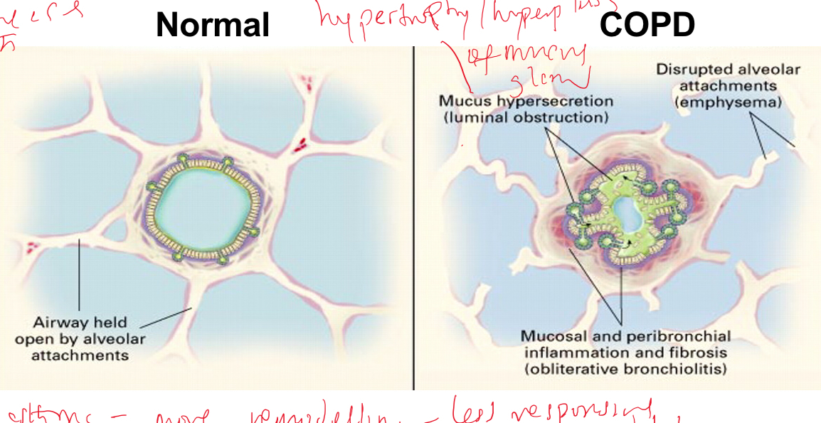 Mucus hypersecretion- due to hypertrophy/hyperplasia of submucosal glands and goblet cells